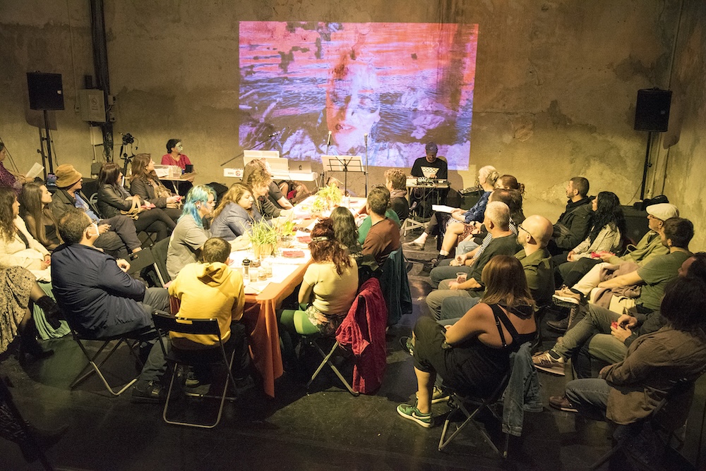 ]eco.philia.sym.posion[ takes place around a table in the form of an intimate dinner, where whilst the audio-visual media is used to enhance the immersive atmosphere. Through the embodied knowledge that is built collectively and the value of sharing, ]eco.philia.sym.posion[ constructs a new narrative that opposes the dystopian landscape and invites us to imagine a different future.
