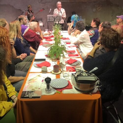 ]sym.posion[ is a series of multimedia performances that invites the audience to a table where a new subject is explored each time. Our work draws on the ancient spirit of the symposium, where food, dialogue, and collective reflection were inseparable. Conceived as a contemporary symposium, ]sym.posion[ transforms the setting of an intimate dinner into a space for shared reflection and exchange. The table becomes both stage and commons: a site for a ritual where live music interweaves with gestures, words and projections like courses in a collective feast. As images, movements and poetic text unfold within an immersive soundscape, themes of democracy, ecology, and collective action flow through the gathering, asking how we might live and act in relation to each other and our home, Earth.